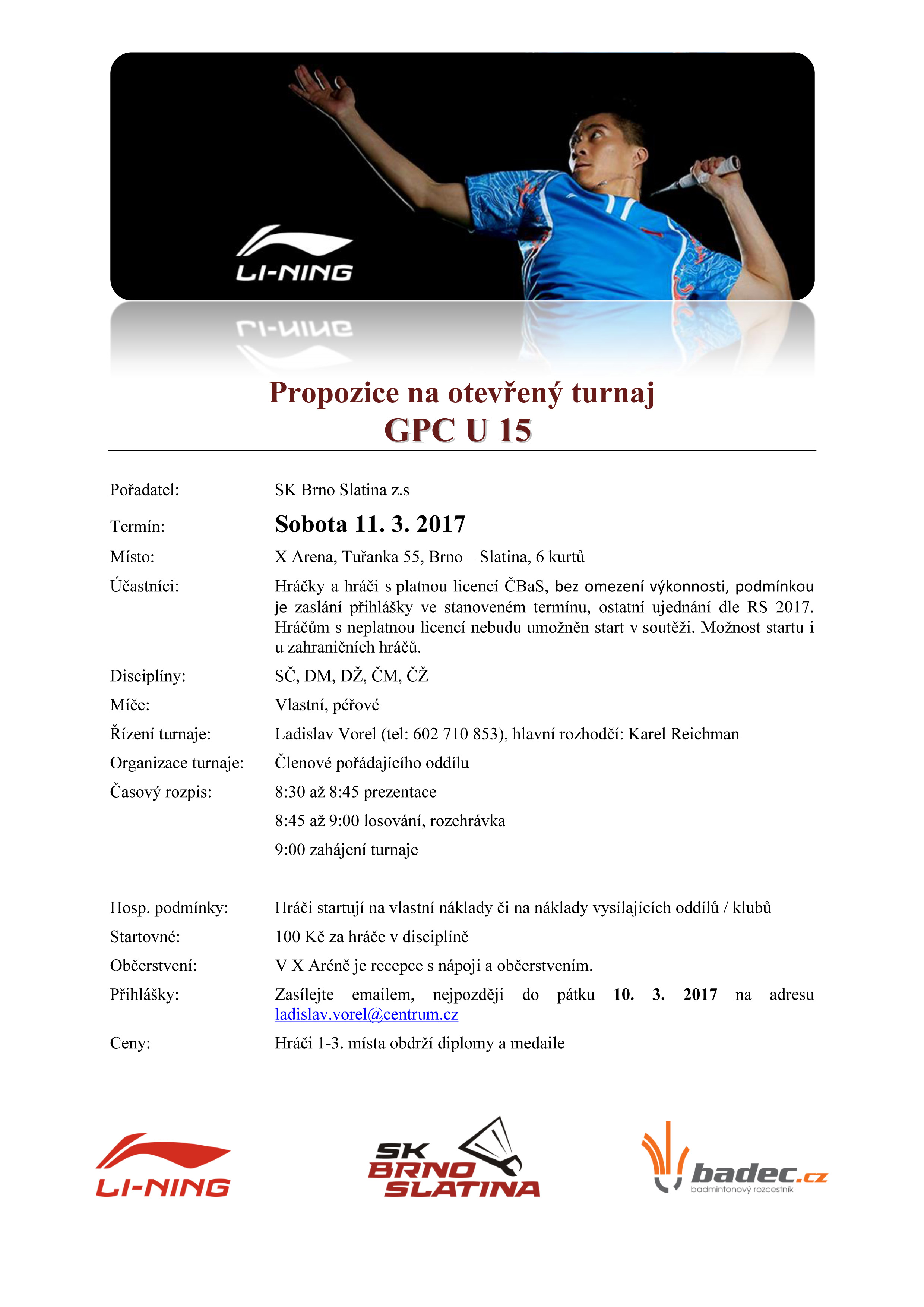 SK Brno Slatina zve hráčky a hráče na otevřený trunaj GPC U15 v badmintonu, který proběhne v sobotu 11.03.2017 v X Aréně.